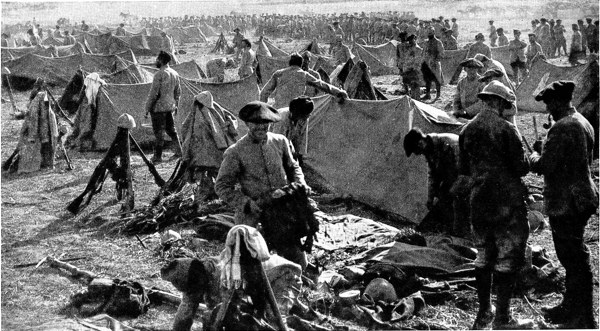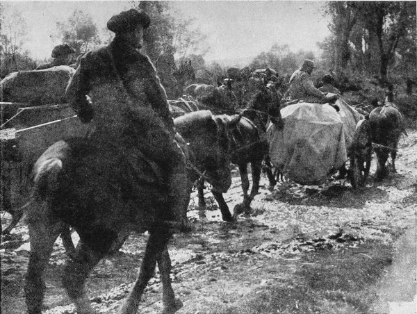 IT is cold and chill, and a steady drizzle is oozing from the sky above into the earth beneath, and is making it soft and slippery. I awake, yawn, stretch sleepily, and gaze out into the grey dejection of the morning. I have been sleeping luxuriously on the floor of an ambulance, wedged in between two trunks and a duffle-bag.