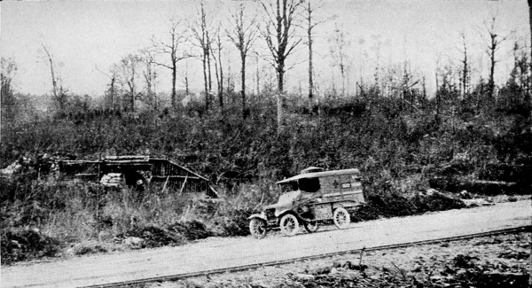 For five days we proceed thus, with the white road stretching out in front and the brown dust trailing behind. We stop to get gasoline, to eat, and to sleep. We begin to near the front, and pass through town after town of roofless houses, shattered churches, and scattered homes. Through fields dotted with wooden crosses with the tricolored ribbon, and pock-marked with shell-holes. We pass aeroplane hangars and batteries of guns. We see more saucisses in the sky and soldiers on the ground. The hand of the Hun lies heavy on the land, and his poison breath scorches the grass of the fields. We see fewer civilians and more steel helmets, and yet the rumble of the guns is no louder. But there is a certain breath of power and energy in the air, and one feels himself waiting for something to happen.