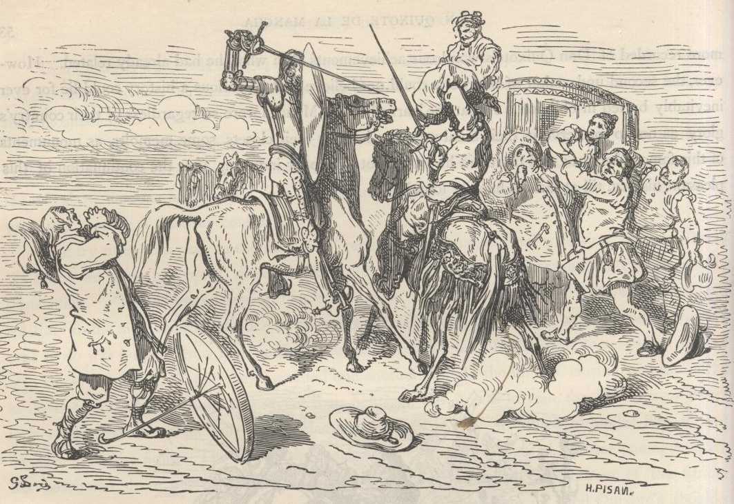 With trenchant swords upraised and poised on high, it seemed as though the two valiant and wrathful combatants stood threatening heaven, and earth, and hell, with such resolution and determination did they bear themselves. The fiery Biscayan was the first to strike a blow, which was delivered with such force and fury that had not the sword turned in its course, that single stroke would have sufficed to put an end to the bitter struggle and to all the adventures of our knight; but that good fortune which reserved him for greater things, turned aside the sword of his adversary, so that although it smote him upon the left shoulder, it did him no more harm than to strip all that side of its armour, carrying away a great part of his helmet with half of his ear, all which with fearful ruin fell to the ground, leaving him in a sorry plight.