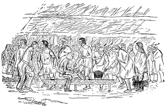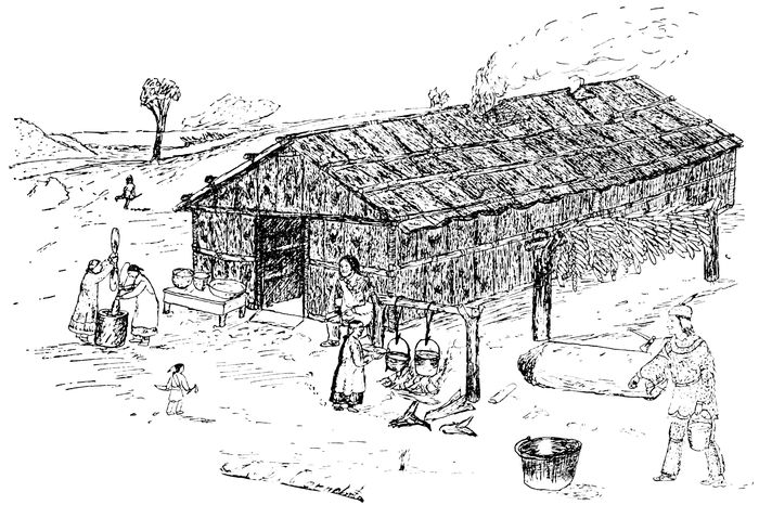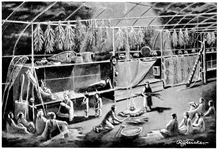 From a Painting Showing the Interior of a Bark Long house, by Richard J. Tucker.