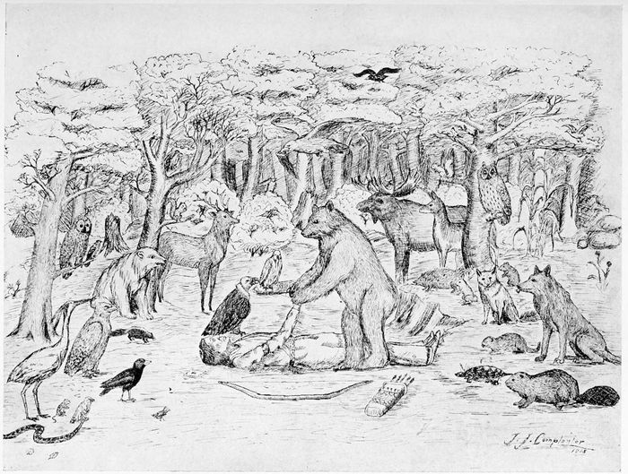 To our camp came many Indian friends who sought to instruct Mr. Harrington and myself in the lore of the ancients. We were regaled with stories of the false faces, of the whirl-winds, of the creation of man, of the death panther, and of the legends of the great bear, but in particular we were blessed with an ample store of tales of vampire skeletons, of witches and of folk-beasts, all of whom had a xspecial appetite for young men who dug in the ground for the buried relics of the “old-time folks.”