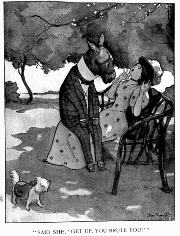 A woolly little terrier pup Gave vent to yelps distressing, Whereat his mistress took him up And soothed him with caressing, And yet he was not in the least What one would call a handsome beast. He might have been a Javanese, He might have been a Jap dog, And also neither one of these, But just a common lapdog, The kind that people send, you know, Done up in cotton, to the Show. At all events, whate'er his race, The pretty girl who owned him Caressed his unattractive face And petted and cologned him, While, watching her with mournful eye, A patient ass stood silent by. "If thus," he mused, "the feminine And fascinating gender Is led to love, I, too, can win Her protestations tender." And then the poor, misguided chap Sat down upon the lady's lap. Then, as her head with terror swam, "This method seems to suit you," Observed the ass, "so here I am." Said she, "Get up, you brute you!" And promptly screamed aloud for aid: No ass was ever more dismayed. [Illustration: "SAID SHE, 'GET UP, YOU BRUTE YOU!'"] They took the ass into the yard And there, with whip and truncheon, They beat him, and they beat him hard, From breakfast-time till luncheon. He only gave a tearful gulp, Though almost pounded to a pulp. THE MORAL is (or seems, at least, To be): In etiquette you Will find that while enough's a feast A surplus will upset you. Toujours, toujours la politesse, if The quantity be not excessive. |