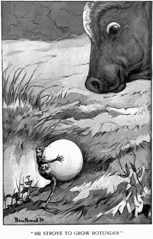 Once, on a time and in a place Conducive to malaria, There lived a member of the race Of Rana Temporaria; Or, more concisely still, a frog Inhabited a certain bog. A bull of Brobdingnagian size, Too proud for condescension, One morning chanced to cast his eyes Upon the frog I mention; And, being to the manner born, Surveyed him with a lofty scorn. Perceiving this, the bactrian's frame With anger was inflated, Till, growing larger, he became Egregiously elated; For inspiration's sudden spell Had pointed out a way to swell. "Ha! ha!" he proudly cried, "a fig For this, your mammoth torso! Just watch me while I grow as big As you--or even more so!" To which magniloquential gush His bullship simply answered "Tush!" Alas! the frog's success was slight, Which really was a wonder, In view of how with main and might He strove to grow rotunder! And, standing patiently the while, The bull displayed a quiet smile. [Illustration: "HE STROVE TO GROW ROTUNDER"] But ah, the frog tried once too oft And, doing so, he busted; Whereat the bull discreetly coughed And moved away, disgusted, As well he might, considering The wretched taste that marked the thing. THE MORAL: Everybody knows How ill a wind it is that blows. |